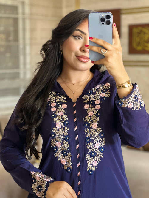 جلابة مغربية أنيقة مصنوعة من ثوب المليفة الراقي، خفيفة ومريحة فاللبس، ومطرزة بتطريزات دقيقة تعطيها لمسة فخمة وراقية. التصميم ديالها كيجمع بين الأصالة المغربية والأناقة العصرية، باش تباني مميزة فكل مناسبة.